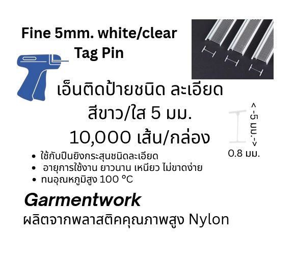 เอ็นติดป้าย , กระสุนยิงป้าย , กระสุนพลาสติค ชนิดละเอียด เนื้อไนล่อน 5 มิลลิเมตร Fine Tag pin 5 mm. Nylon ยี่ห้อ Garmentwork